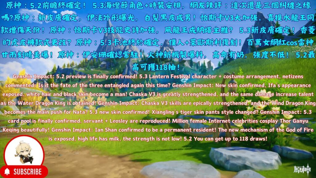 原神:5.2前瞻終確定! 5.3海燈節角色+時裝安排,網友辣評:這次還是三個糾纏之緣嗎?原神:新皮膚確定,伊法外形曝光,白髮黑皮成男!恰斯卡V3大加強,喜提水龍王同款增傷天份!原神:恰斯卡V3技能史詩加強,風龍王成納塔主推? 5.3新皮膚確定!香菱的虎皮褲款式更改?原神:5.3卡池終於確定,僕人+萊歐斯利復刻!百萬女網紅cos雷神甘雨刻晴美爆!原神:伊安珊確認常駐!火神新機製爆料,高命有奶,強度不低! 5.2最高可獲118抽!