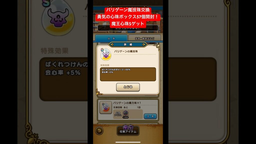 バリゲーンの魔技珠交換。勇気の心珠ボックス57個開封!魔王の心珠Sゲット!#ドラクエウォーク #勇気の心珠