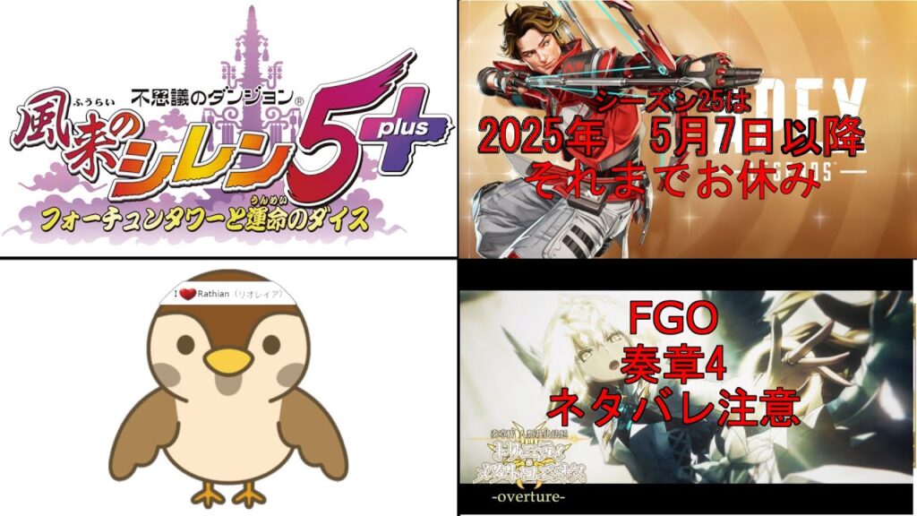風来のシレン5plus(原始に続く穴)、APEX Legends(お休み)、Fate Grand Orderの三画面でプレイします。