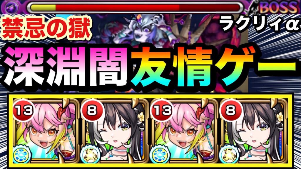 【モンスト】ラクリィαの”友情ゲー”で深淵闇が溶ける!?wwwラクリィα×ゲキリン編成で禁忌深淵闇に挑んでみた! gameman 3か月前 『ラクリィα』使ってみた 禁忌の獄深淵闇 全員レベル120、超戦型解放 1P 速必殺EL、戦型加撃EL、同族加撃速EL、紋章対闇極&弱極&収檻回避 2P 友撃L、同族加撃L、紋章対闇極&弱極&収檻回避&伝染抵抗上 3P 速必殺EL、同族加命撃EL、同族加撃EL、紋章対闇極&弱極&収檻回避&伝染抵抗上 4P 兵命L、将命L、友撃L、紋章対闇極&弱極&将極&収檻回避 ラクリィα2、ゲキリン2