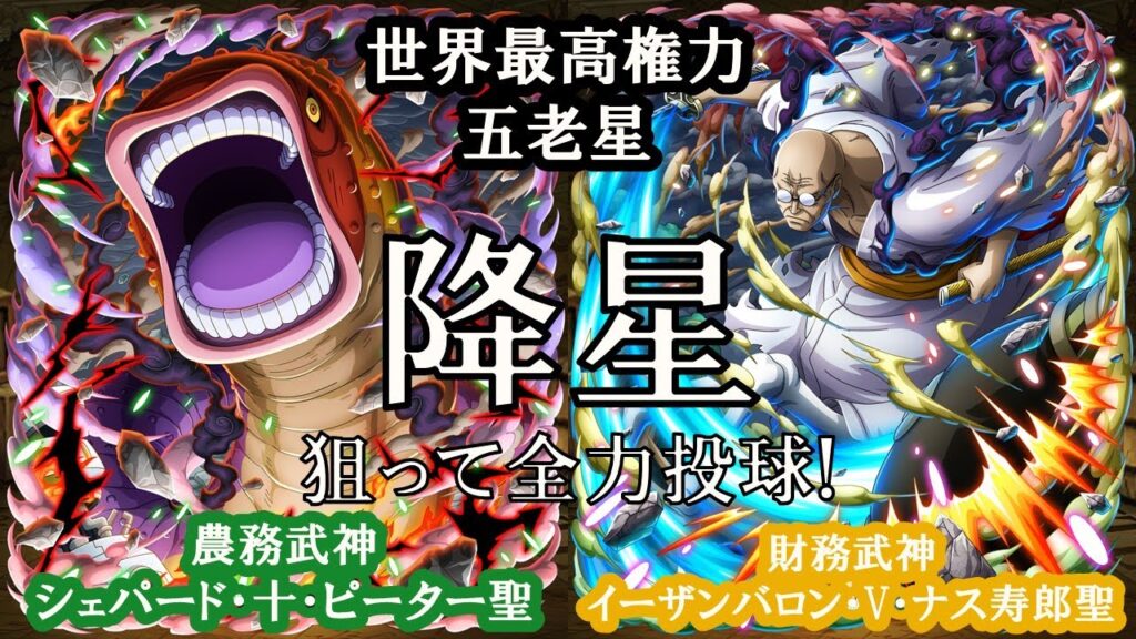 今回はワンピーストレジャークルーズにて満を持して登場した世界最高権力五老星 農務武神「 #シェパード・十・ピーター聖 」財務武神「#イーザンバロン・V・ナス寿郎聖 」をお迎えしていきます.