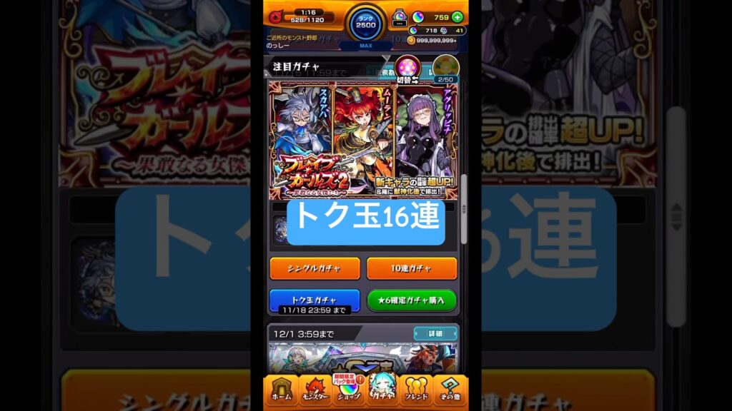 [モンスト]ムーラン狙い!『ブレイブ•ガールズ2』トク玉16連ひいてみた!![怪物彈珠] #shorts