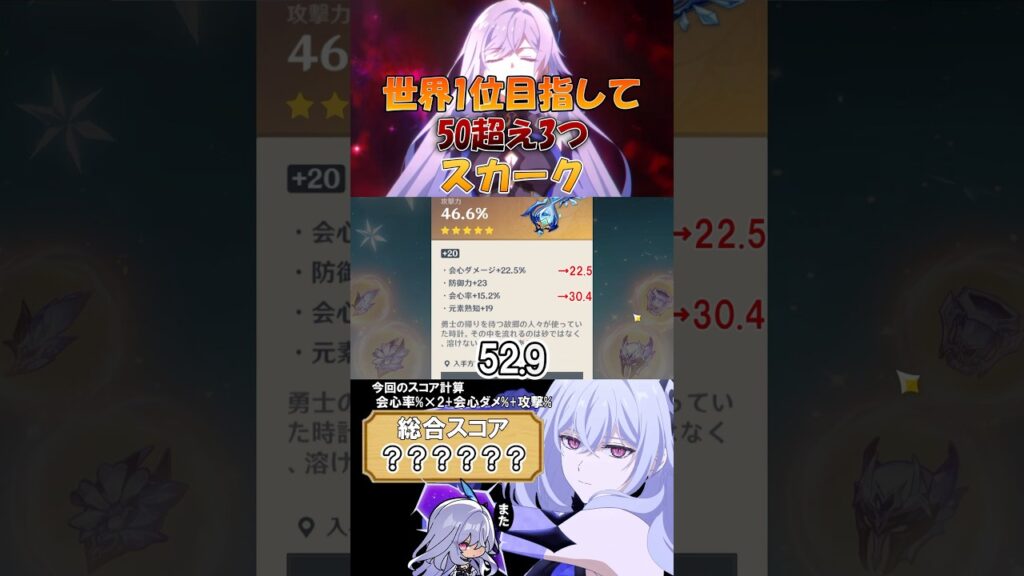 [原神/聖遺物鑑賞]世界1位目指して奮闘中!スカーク登場!#genshinimpact #原神 #shorts #hoyocreators #スカーク #原神聖遺物 #切り抜き #聖遺物鑑賞 gameman 1週間前 チャンネル登録・高評価お願いします! X(旧:Twitter)「フォローしてくれたら喜びます」 メンバー登録もよろしければお願いします! 今回のスコア計算式 会心ダメージ(%)+会心率(%)×2+攻撃力(%) TikTok(是非フォローお願いします) #原神 #vtuber #genshin #shorts #short #genshinimpact #聖遺物厳選 #聖遺物鑑賞 #切り抜き #原神切り抜き #スカーク