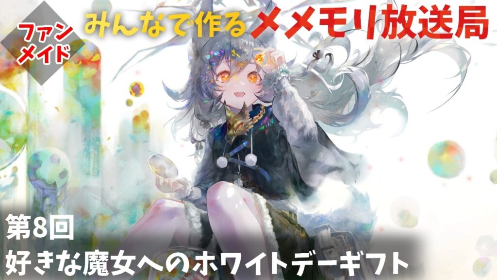 今回は第8回、3月ということで、好きな魔女にあげたいホワイトデーギフトを紹介していきます!お題のメッセージはマシュマロからお願いします。メメントモリの領主たちでいろいろ話せる場所が欲しい!ってことで始まりまった皆で作るメメモリ放送局!最新情報のチェックや皆さんからの動画やお便り、イラスト紹介などをやっていきます!